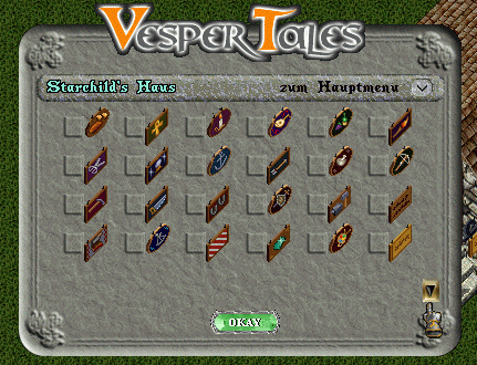 Für alle stolzen Hausbesitzer auf VesperTales bietet das Hausschild-Menü einen ganzen Haufen an Optionen, um das Haus zu verwalten und zu konfigurieren. Hier ein Blick auf das Hauptmenü, das man per Doppelklick auf das Schild des Hauses erreicht, so man denn Besitzer oder Freund des Hauses ist: