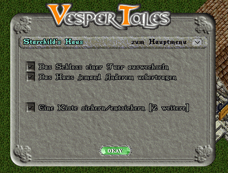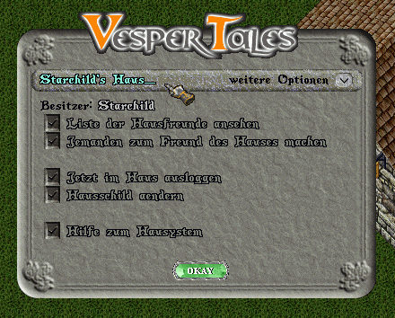 Die verschiedenen Menüpunkte sind weitgehend selbsterklärend, aber trotzdem sollen sie hier kurz erläutert werden. Nach Änderung des Namens darf man nicht vergessen, das Menü durch einen Klick auf Okay zu schliessen, da sonst der neue Name nicht übernommen wird.st wird er nicht übernommen wird. Er kann die Liste einsehen und Einträge aus ihr löschen, und er kann Charaktere zu neuen Hausfreunden ernennen. Als Hausfreund hat man den Vorteil, daß man das Hausmenü einsehen und eingeschränkt benutzen, sowie die sicheren Kisten des Hauses öffnen kann. Zum Thema 'sichere Kisten' gleich mehr. Der Hausbesitzer kann maximal 12 Charaktere zu Freunden des Hauses ernennen.